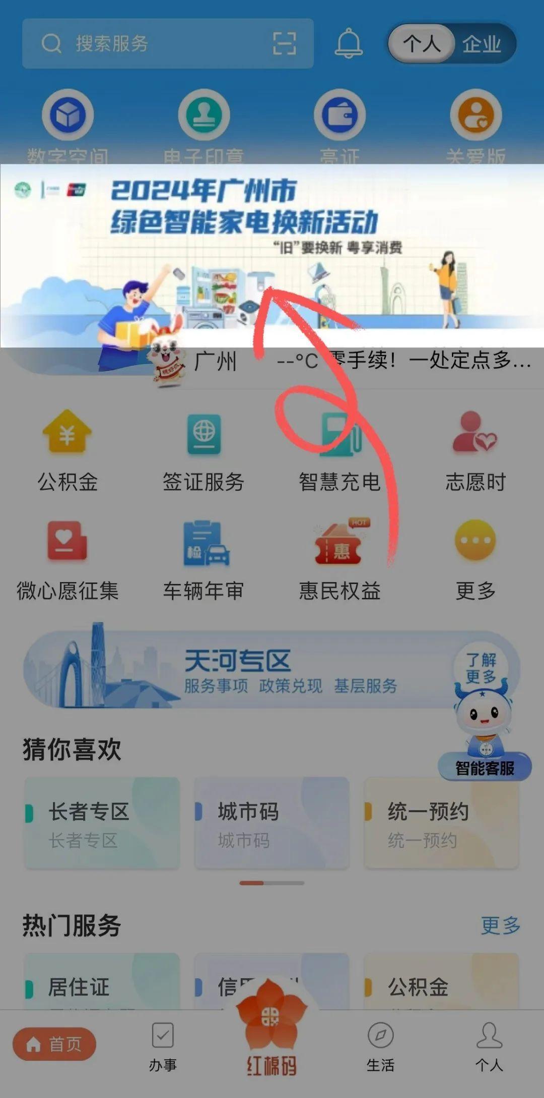 方式三:打开“穗好办”APP,点击首页上方,“2024年广州市绿色智能家电换新活动”轮播图,即可进入领券页面。