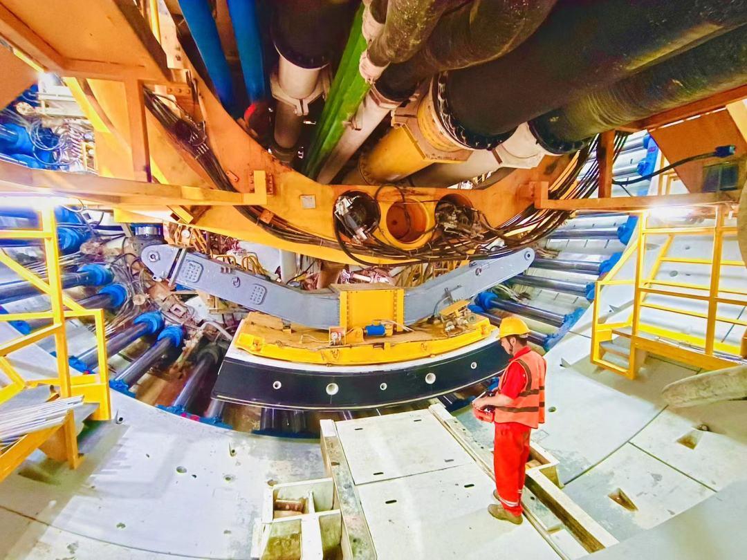 据中铁十四局项目负责人李兵介绍,“深江1号”盾构机为我国自主研发的“国之重器”,盾构机全线长距离下坡掘进,下穿珠江入海口,工程地质条件极其复杂。为适应海底复杂工况,项目对盾构机进行了一系列针对性设计和优化,盾构机总长130米,总重3800吨,开挖直径13.42米。目前,盾构机已累计掘进3320米。