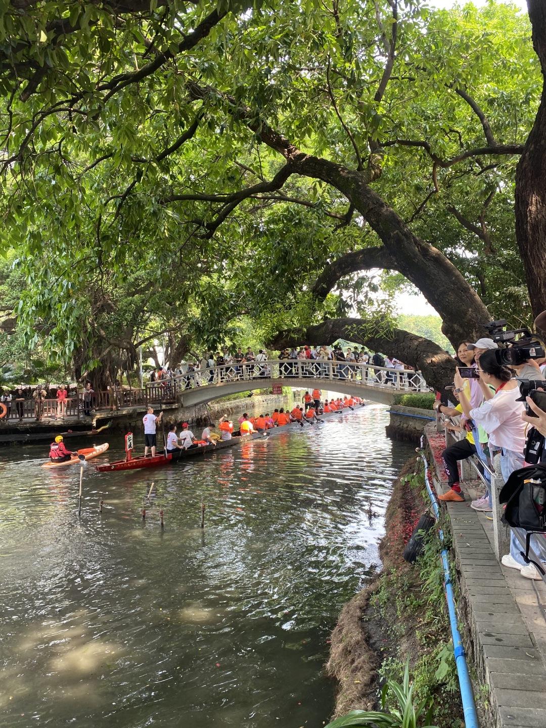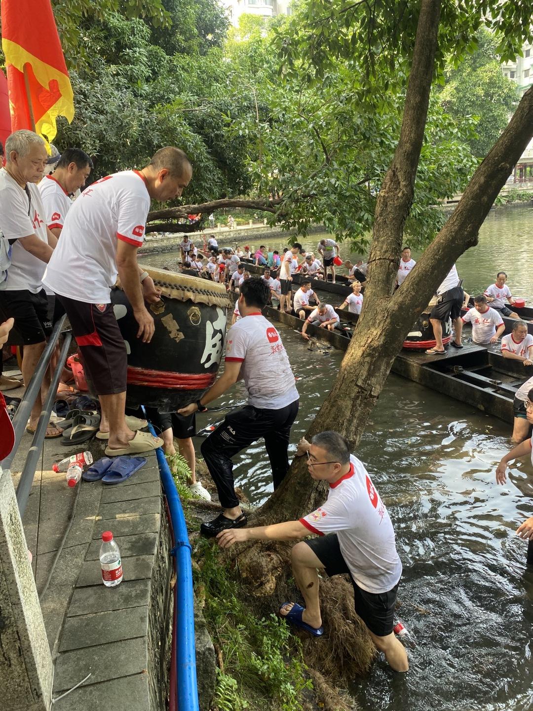 随着龙船出水,村民安装好龙头、龙尾,将龙船鼓、龙船牌放到龙船上,迫不及待试水试扒。美丽的荔湾湖上,村民兴致勃勃、精神抖擞,在湖面扒了好几个来回。龙船鼓声和荔枝湾大戏台的粤剧声交织,吸引市民游客围观欣赏。