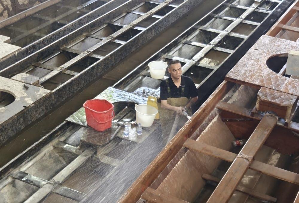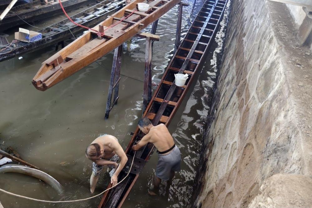 当天上午9时许,记者在丹山分洪河(沙头街)右岸沙头村龙船坞看到,龙船坞里的水已基本抽干,5条传统龙舟露出水面,多名村民撸起袖子在擦洗龙舟。