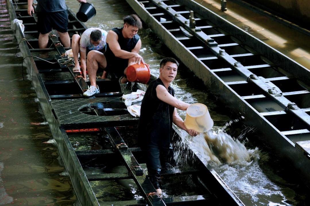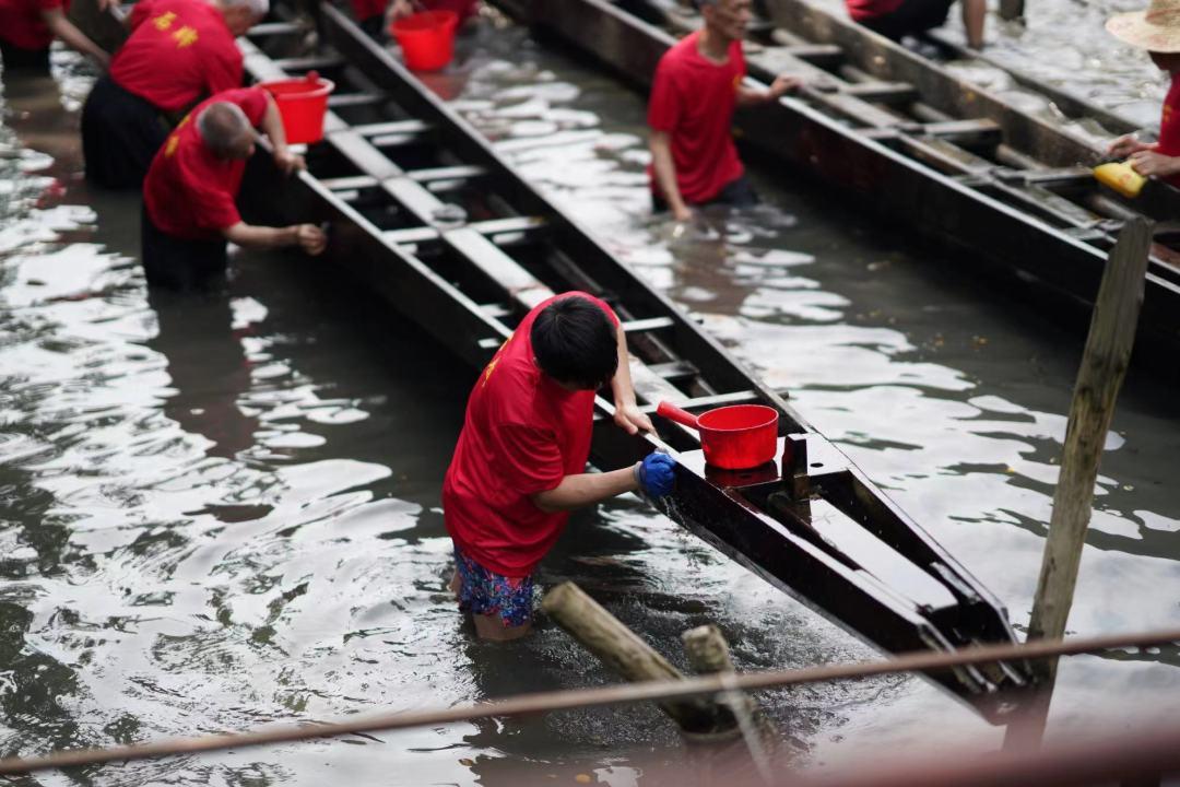 “桡手们”一边用力摇松船底泥浆,一边用水桶、水勺等工具将船舱积压的泥沙尽数掏出,8条龙船在众人合力之下陆续“出水”。“出水”后用抹布仔细擦拭船身,再将船送到船厂进行检修、调校,涂抹猪油。