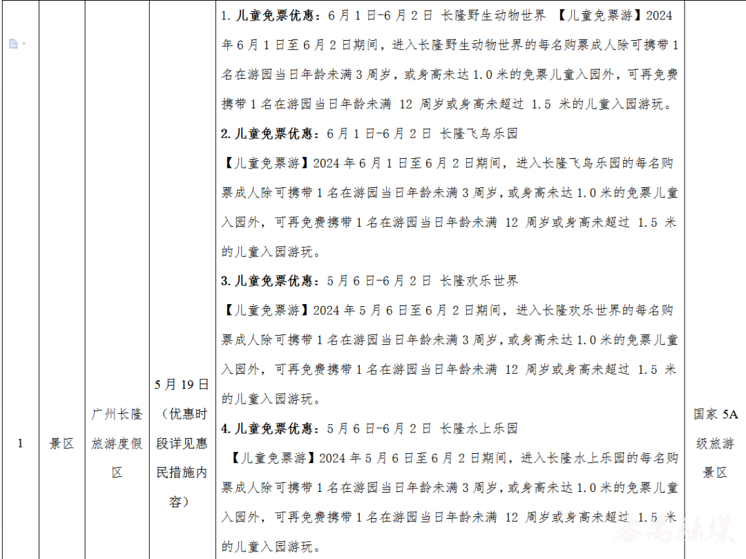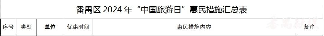 今年5月19日是第14个“中国旅游日”,主题是“畅游中国,幸福生活”。记者从广州市番禺区文广旅体局了解到,番禺区各大景区将在中国旅游日当天推出门票半价或八折优惠,此外,部分景区内的酒店、餐厅等也将推出多项优惠措施,为游客献上诚意满满的“旅游大礼包”。