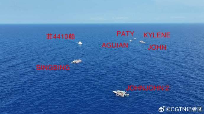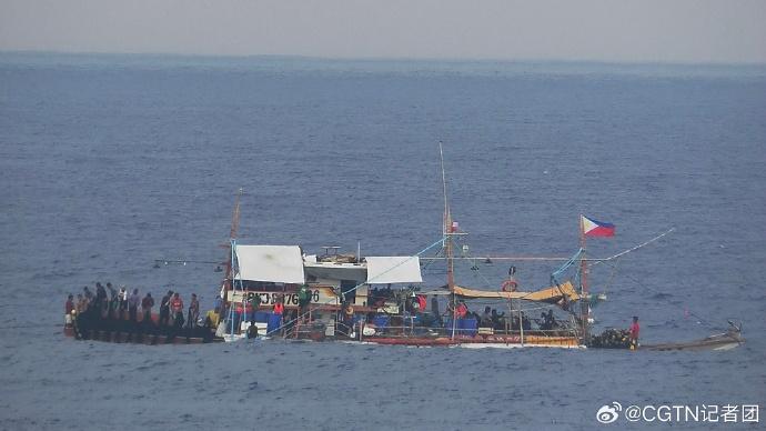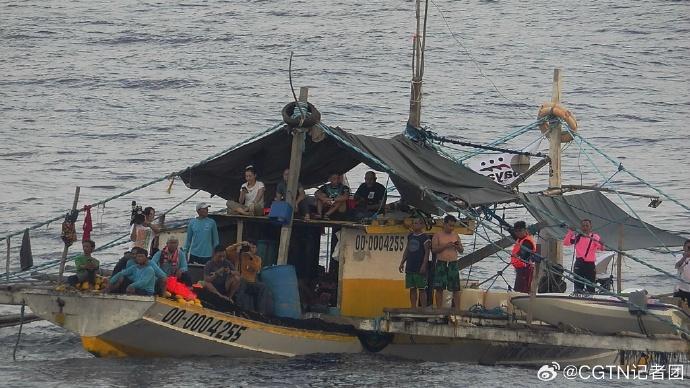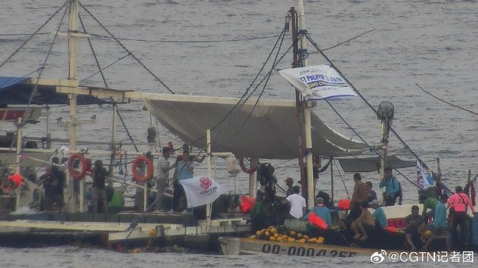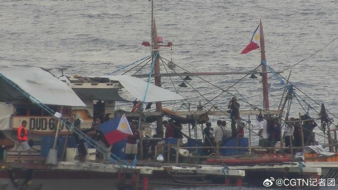 菲方在现场通过下网捕鱼作业、展示旗帜等方式作秀,中国海警依法对菲方非法聚集船只进行现场管制。