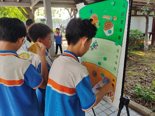 以“健康饮食 会看会吃”为主题的科普游园活动也在科普讲座举办时同步进行。此次游园活动设置四个游戏体验区,分别是零食大冒险区、合作建宝塔区、“拼营养,解秘密”区和食物对对碰区。通过游戏,同学们在获得乐趣的同时,也能学到实用的健康知识。