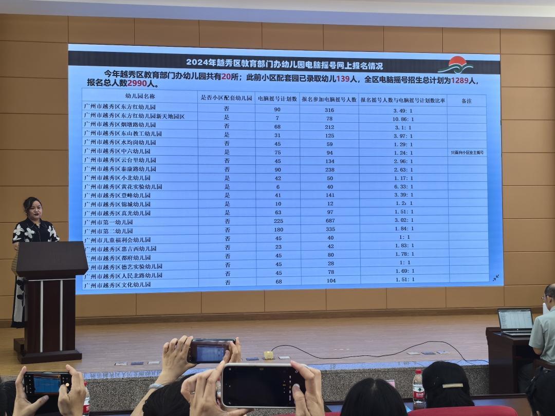2024年5月17日上午9:30,越秀区教育部门办幼儿园招生电脑摇号仪式举行。参加本次越秀区教育部门办幼儿园招生电脑摇号仪式包括区人大、区政协和区教育局相关负责人,以及幼儿园、家长代表约30人,广州市公证处对现场电脑摇号过程进行了公证。