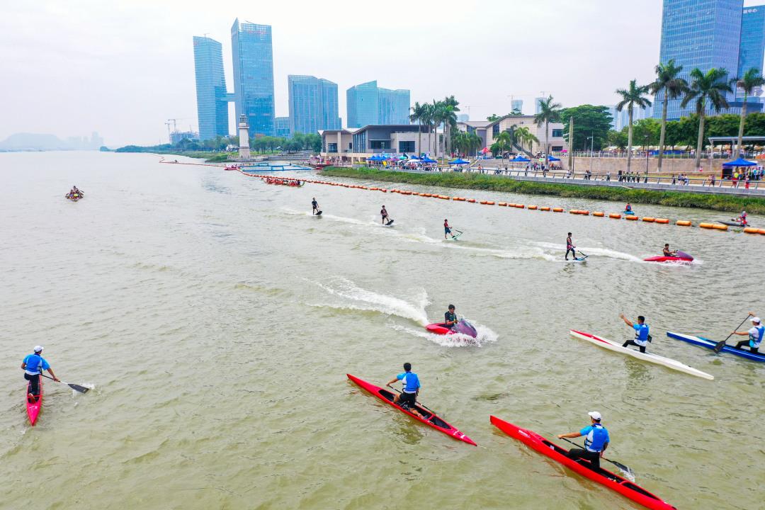 活动现场中,脚踏电动冲浪板的周晓锋和梁皓朗在蕉门水道上炫酷、矫健的身影十分引人注目,作为该项运动项目的爱好者和推广者,周晓锋接触电动冲浪板运动已有两年时间,他现场表演的前趴、后趴动作几乎将身体放平紧贴水面,这让现场观众惊叹不已。