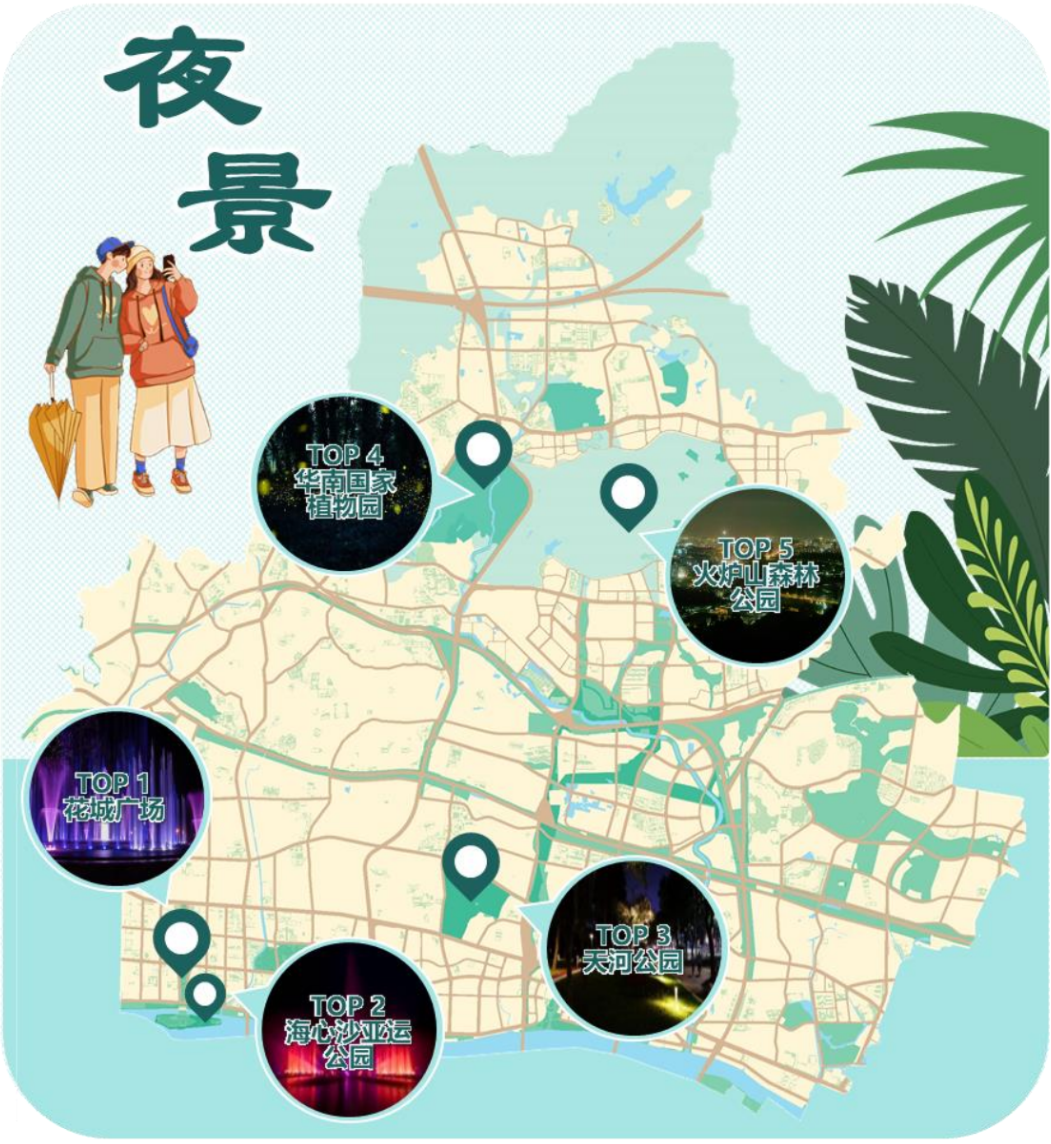 天河区TOP5受欢迎的“夜景”游赏点有:花城广场、海心沙亚运公园、天河公园、华南国家植物园、火炉山森林公园。