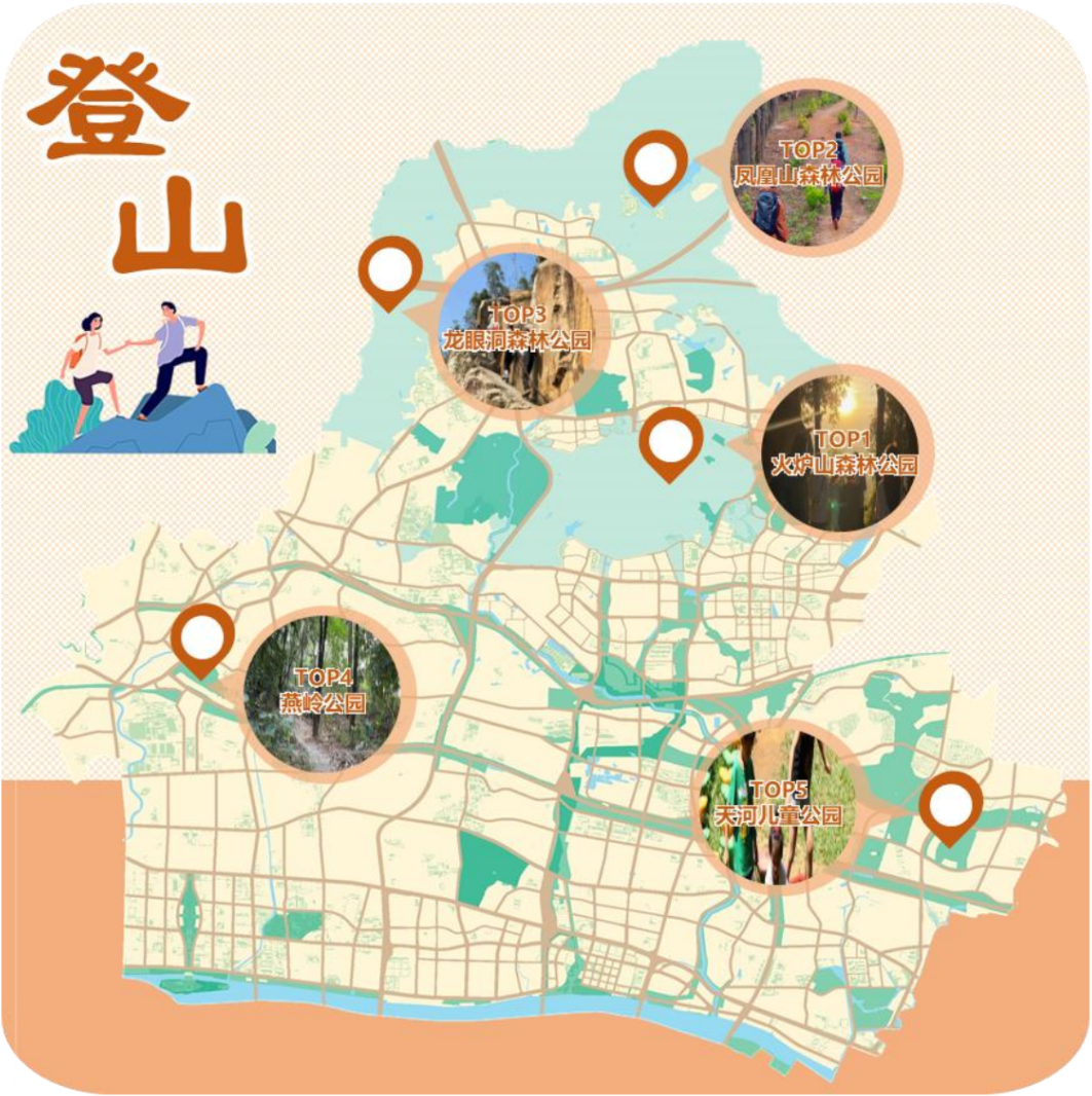 天河区TOP5受欢迎的登山场地是:火炉山森林公园、凤凰山森林公园、龙眼洞森林公园、天河儿童公园、燕岭公园。