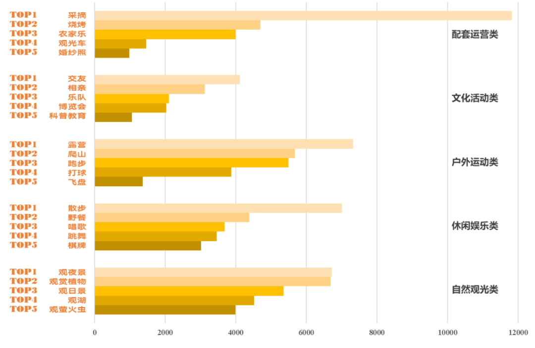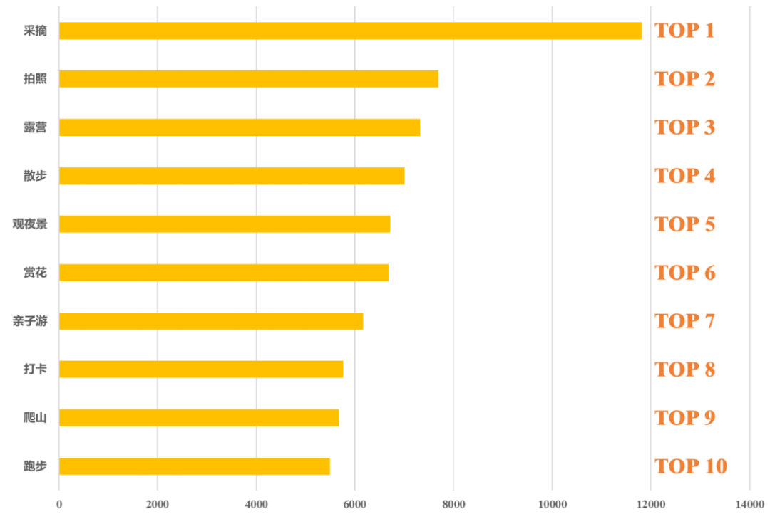 整理多个App笔记评论数据进行词频分析得出,天河区最热门的公园活动项目有五类(配套运营类、文化活动类、户外运动类、休闲娱乐类、自然观光类)共75种玩法,最热门的10种玩法为:采摘、拍照、露营、散步、观夜景、赏花、亲子游、打卡、爬山、跑步。