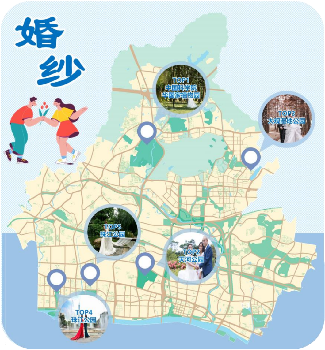 自然风景打卡观光场景中,华南国家植物园的赏花、花城广场的夜景、火炉山森林公园的氧吧、天河公园的赏湖最受人们喜爱。悸动青春交友活动场景中,华南国家植物园的婚纱摄影、天河公园的相亲、花城广场的散步、天河湿地公园的露营等活动最受欢迎。康体健身户外运动场景中,最受欢迎的有花城广场的夜跑、火炉山森林公园的登山、天河儿童公园的亲子运动等。
