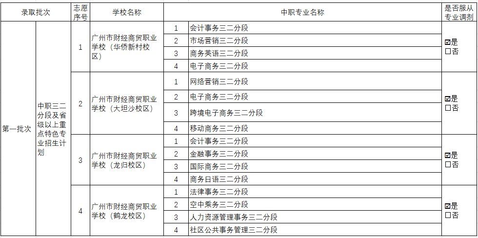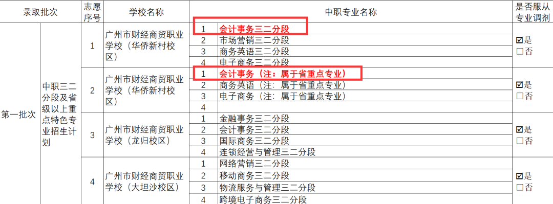 PS:不同学校的省重点专业范围都会有所不同。例如会计事务专业,在广州市财经商贸职业学校是属于省重点专业,但有可能在其他学校就没列入省重点专业行列。所以大家报考的时候要看清楚学校的招生计划表,以此为准。