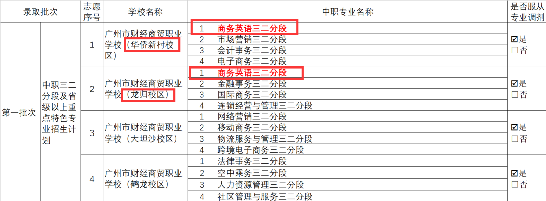 某同学B,希望报考财经商贸的“商务英语”三二分段班。而在财商里,华侨新村校区和龙归校区都有开设这个专业,所以可以分开两个志愿填报,被录取的机会自然就更大了。