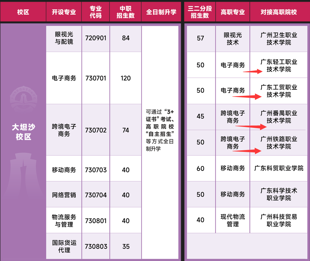 以下17个专业的普通三年中职班:跨境电子商务、移动商务、网络营销、国际货运代理、纳税事务、国际商务、市场营销、连锁经营与管理、商务日语、休闲体育服务与管理、商务助理、安全保卫服务、航空服务、应急救援技术、社区公共事务管理、人力资源管理事务、民政服务。