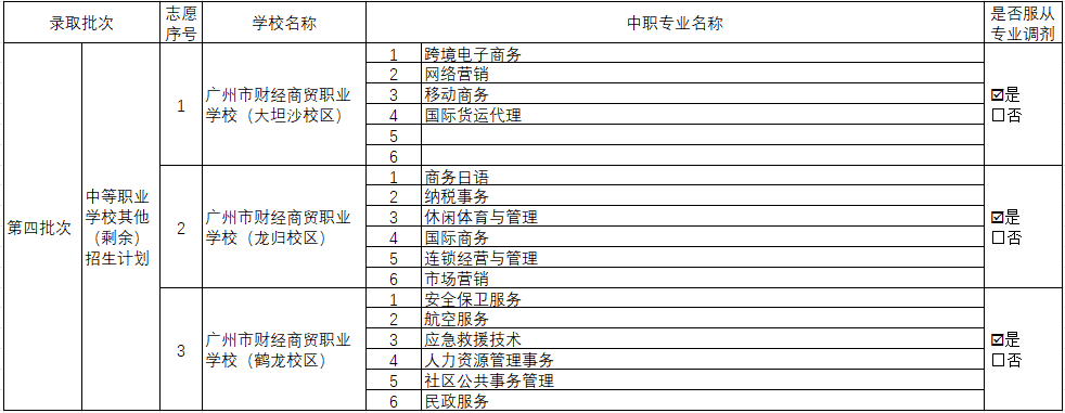 某同学C,希望报考财经商贸的“商务助理”专业三二分段班和中职班。则可以在第一批次志愿1中填写“商务助理三二分段”,然后第四批次的第1志愿中,填写“商务助理”。