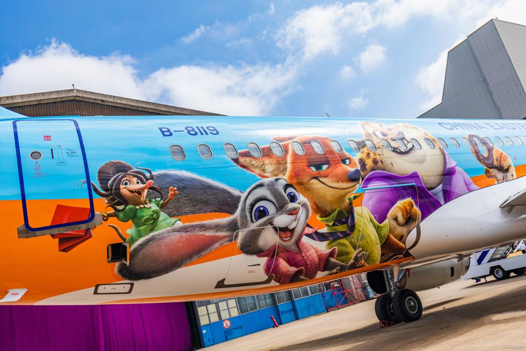 这架全新主题飞机的外形彩绘,栩栩如生地描绘了《疯狂动物城》动画电影中备受喜爱的各种动物角色,在东航彩绘机的机身上,这些动物角色仿佛被高速飞行所刮起的风吹了起来。此外,飞机还创新地使用了飞机涂装贴花技术,成为中国东方航空首架呈现3D立体迪士尼角色图案的主题彩绘飞机。