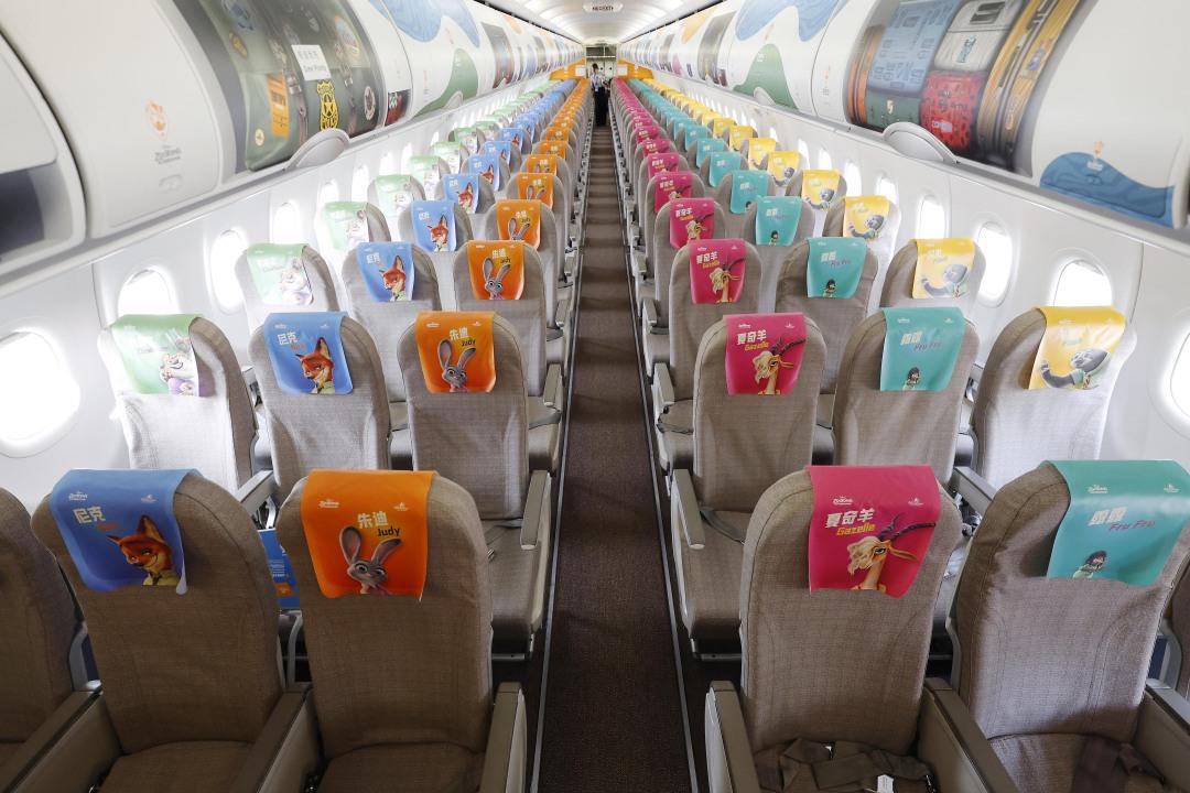 旅客登上“迪士尼•疯狂动物城号”后,会发现遍布机舱内部的主题元素:为不同体型的动物量身打造的行李架图案,以及印有新园区地图、展现动物居民们最喜爱的城中地标的小桌板,以此让旅客在飞行途中获得所喜爱的《疯狂动物城》角色陪伴,并收获灵感。