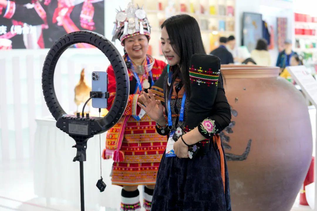 展馆也吸引了众多视频主播驻足,推介清远馆及特色产品,清远馆的参展商工作人员也自发上阵,轮流直播推荐自家产品。