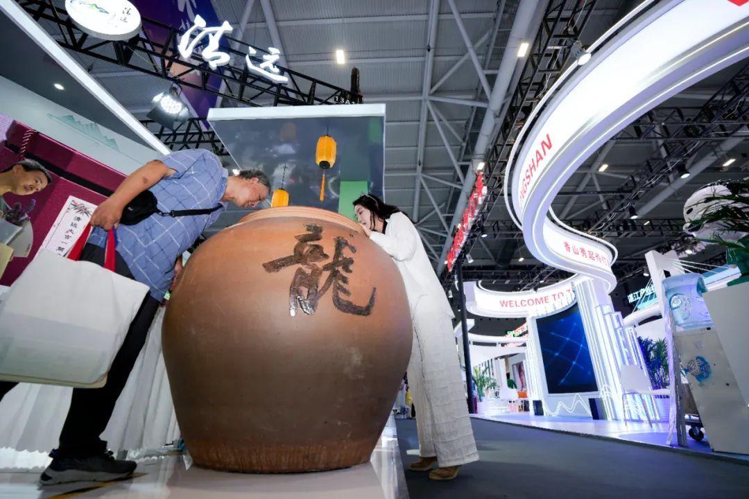 今年的清远馆位于展馆中央道路旁,很多客商来到附近后,都会走过来看一看摆放在最近走道的清远鸡标本和非常显眼的“龙缸”,这个缸融合清远福地文化与众多龙元素,在今年首个龙年龙月龙日龙时篆刻“龙”字,并在清远龙塘镇的220年龙窑中烧制而成,龙塘陶缸制作技艺被列入省级非遗。听到这些独特元素后,很多人纷纷和“龙缸”合影打卡,“龙年、龙缸,好意头,也沾一点福气。”