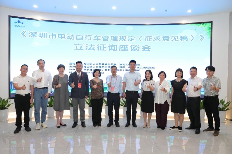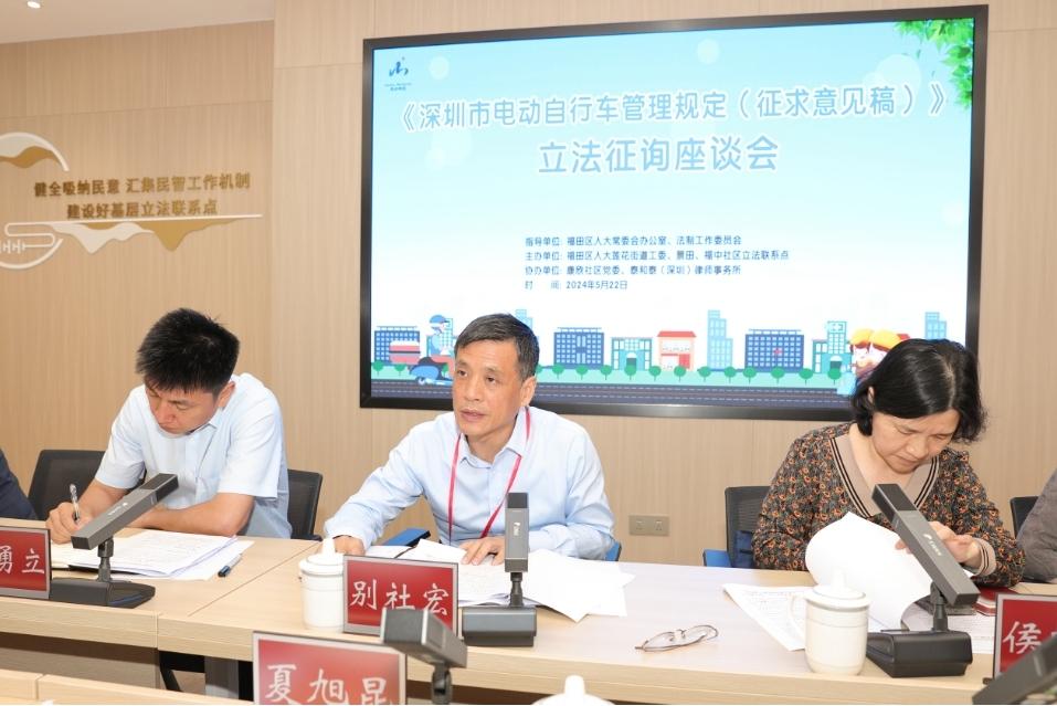 5月22日,深圳福田区人大常委会在福田区人大代表之家举行了《深圳市电动自行车管理规定(征求意见稿)》(以下简称“电动车《管理规定》”)意见征询座谈会。福田区人大常委会党组成员、副主任别社宏,来自莲花街道联组的省、市、区人大代表,福中、景田社区立法联系点立法议事会成员,相关职能部门、相关行业协会专家以及律师、居民代表齐聚一堂,针对电动车《管理规定》展开热烈探讨,汇民意、集众智。