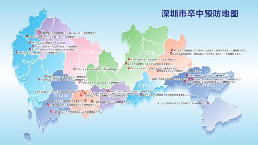在我国当前的卒中防控工作中,应该更加注重“防治并举”“防重于治。如何从“早治疗”向“早预防、早发现、早诊断”转变长效机制,深圳迈开了探索的步伐。2023年10月,在深圳市卫生健康委支持下,深圳市脑血管疾病防治中心、深圳市神经系统疾病医防融合项目组联合构建“深圳市卒中预防地图”,该地图由深圳市10个区,30家"深圳市卒中预防地图示范定点社区健康服务中心"组成。