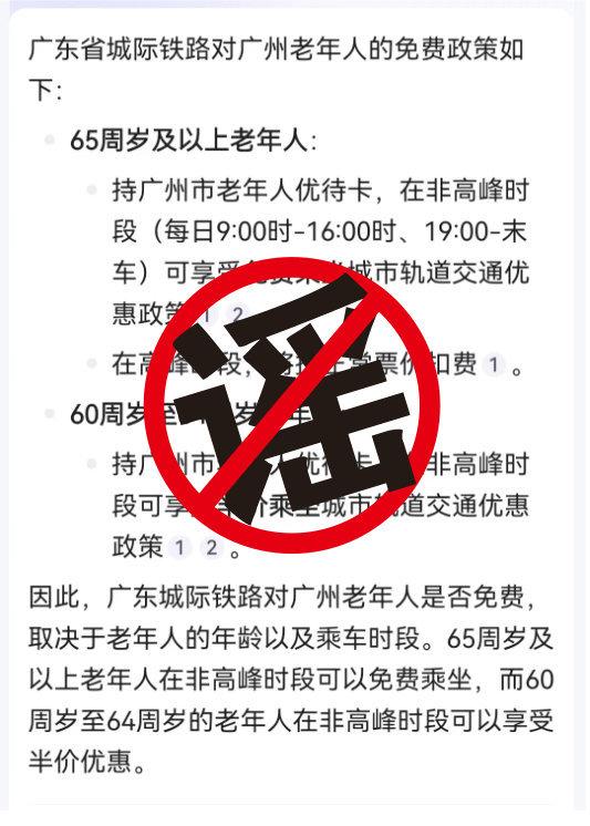5月26日,广佛南环、佛莞城际开通,吸引大批老年人尝鲜体验,广东城际总进站量超9万人次。与此同时,一份《广东省城际铁路对广州老年人的免费政策》截图在社交网络流传,声称广州老年人在非高峰期搭广东城际可享受半价或免费优惠。今天(27日),广东城际公司公开澄清:这是谣传,大家要擦亮眼睛。