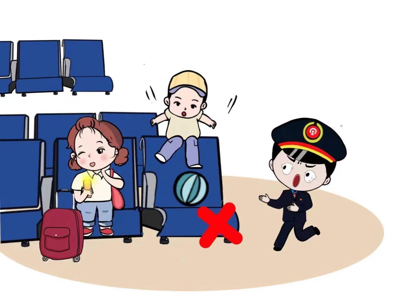 候车时,请小朋友们不要在座椅上攀爬,以免摔伤。