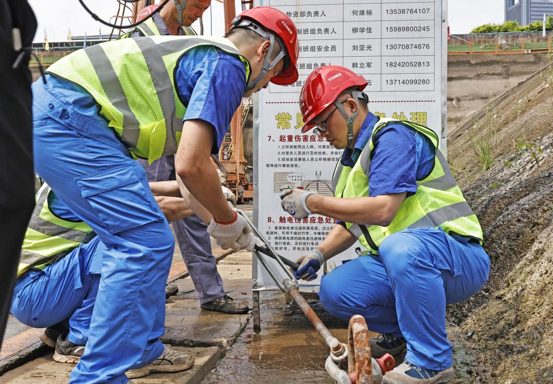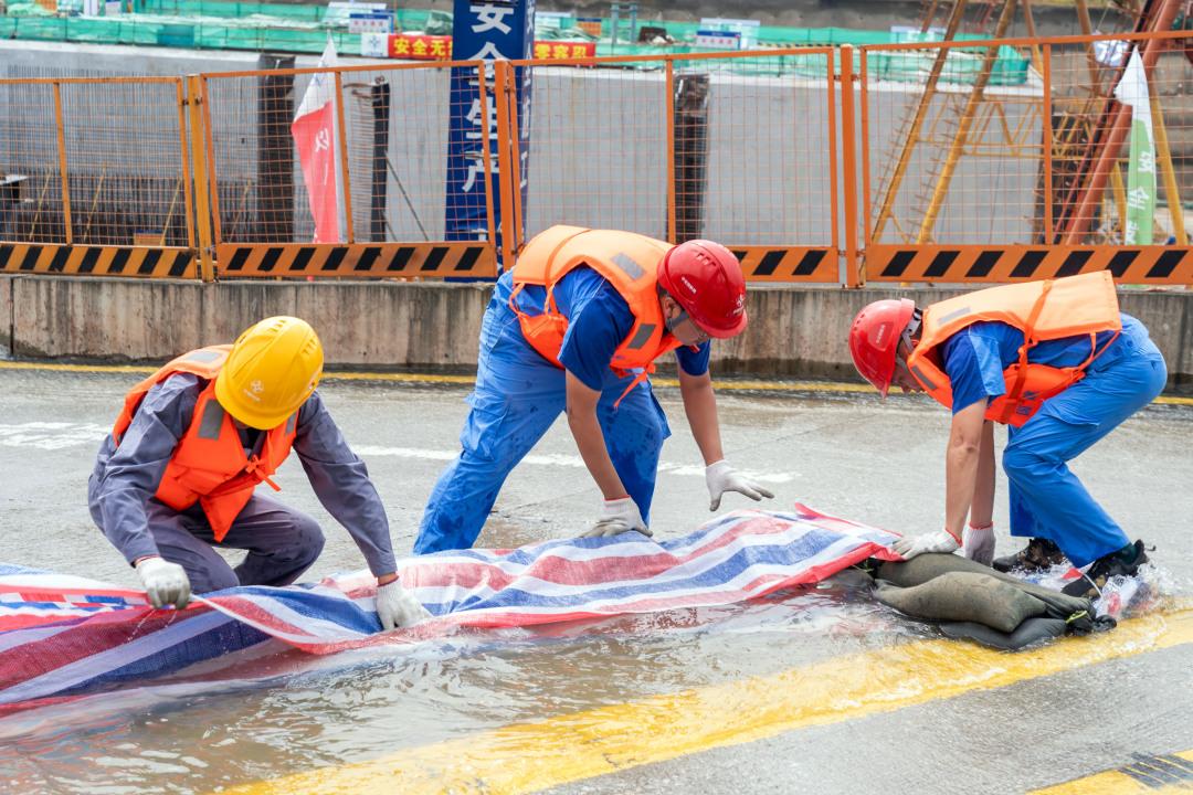 演练分为三防应急演练、受困应急救援和火灾消防应急疏散三个情景。其中三防应急演练是模拟受恶劣天气影响,项目施工场地即开展沙袋围堵、积水强排、船舶避险和组织人员疏散撤离。受困应急救援是模拟施工人员在紧急撤离时,不慎踩空摔倒后的救援行动;火灾消防应急疏散是模拟项目部因电线短路引发火灾后开展人员疏散、初期火情处置。