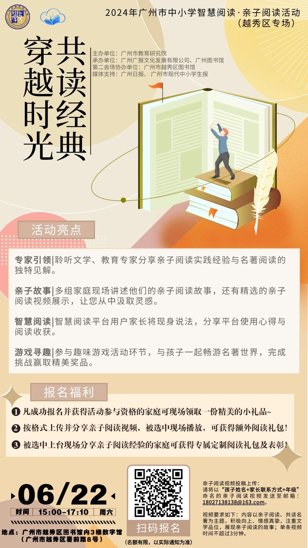 广州市教育研究院精心策划了“2024年广州市中小学智慧阅读·亲子阅读活动”,本次分享会活动以“穿越时光·共读经典”为主题,期待您的参与!