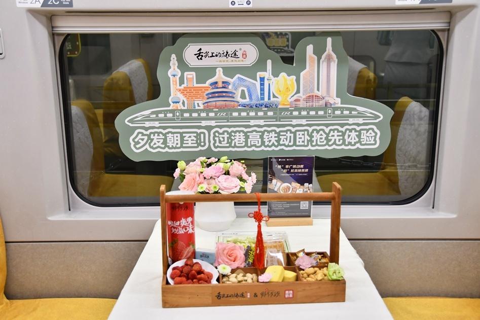 为方便旅客夜间和早晨的用餐需求,动车餐饮公司根据线路特色,特地准备了港式风味荔枝肉套餐、三鲜鱼丸套餐、虾肉馄饨面、蜜汁叉烧肠粉等港式风味餐食,打造“舌尖上的美食之旅”。同时,动卧车厢设置了独立的餐牌,方便旅客了解和选择餐食品种,并可通过扫码铁路畅行码快速点餐。
