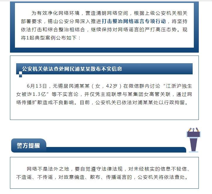 6月13日,无锡居民浦某某(女,42岁)在微信群内讨论“江浙沪独生女被诈1.3亿”等不实言论,并仅凭主观联想与某集团女高管关联,通过网络传播扩散造成不良影响。目前,公安机关已依法对浦某某处以行政拘留。