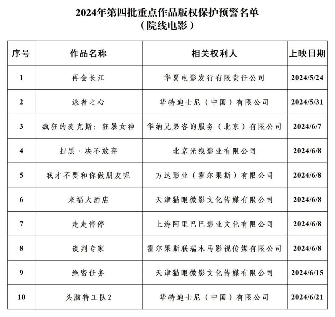 【《谈判专家》等多部院线电影列入版权保护预警名单】国家版权局近日发布2024年度第四批重点作品版权保护预警名单。《谈判专家》等10部院线电影上榜。国家版权局要求,禁止用户上传名单内作品等。详情>>>