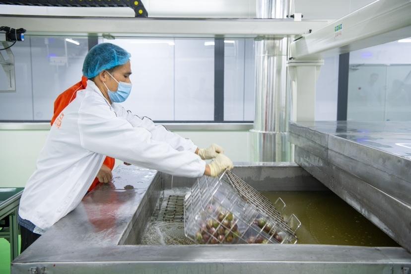 记者现场看到,一颗颗鲜荔枝经过清洗、消毒、烘干、密封包装流程后,进入冻眠处理柜,在这里完成最关键的环节——液氮冻眠处理。