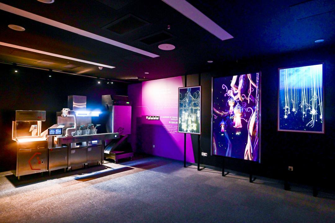 在未来设计创新中心展厅,纳米骨科新材料、三维水墨画、超疏水自清洁图层、3D打印碳纤维头盔……多种多样的学科交互产品让人大开眼界。其中LAVA厨房机器人工作站有着专用轻量化机械臂,能自动从冰柜中拿出薯条、鸡块、鸡翅并放入相应的炸区进行炸制,不一会儿炸制好的薯条就被倒入餐盘中。