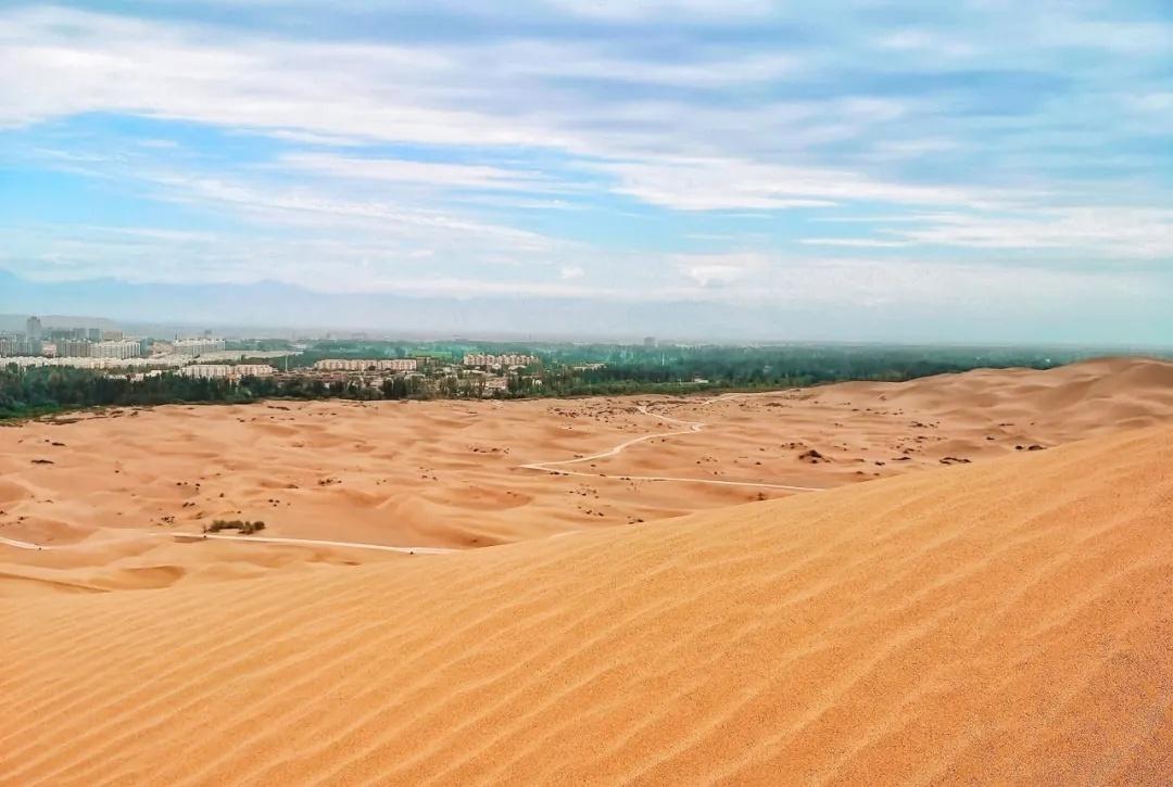 库木塔格沙漠位于新疆吐鲁番市鄯善县,是世界上唯一一座与城市连接的沙漠,有“城中沙漠”之称。沙漠与绿洲紧密相连,创造了“沙不进、绿不退、人不迁”的奇迹。