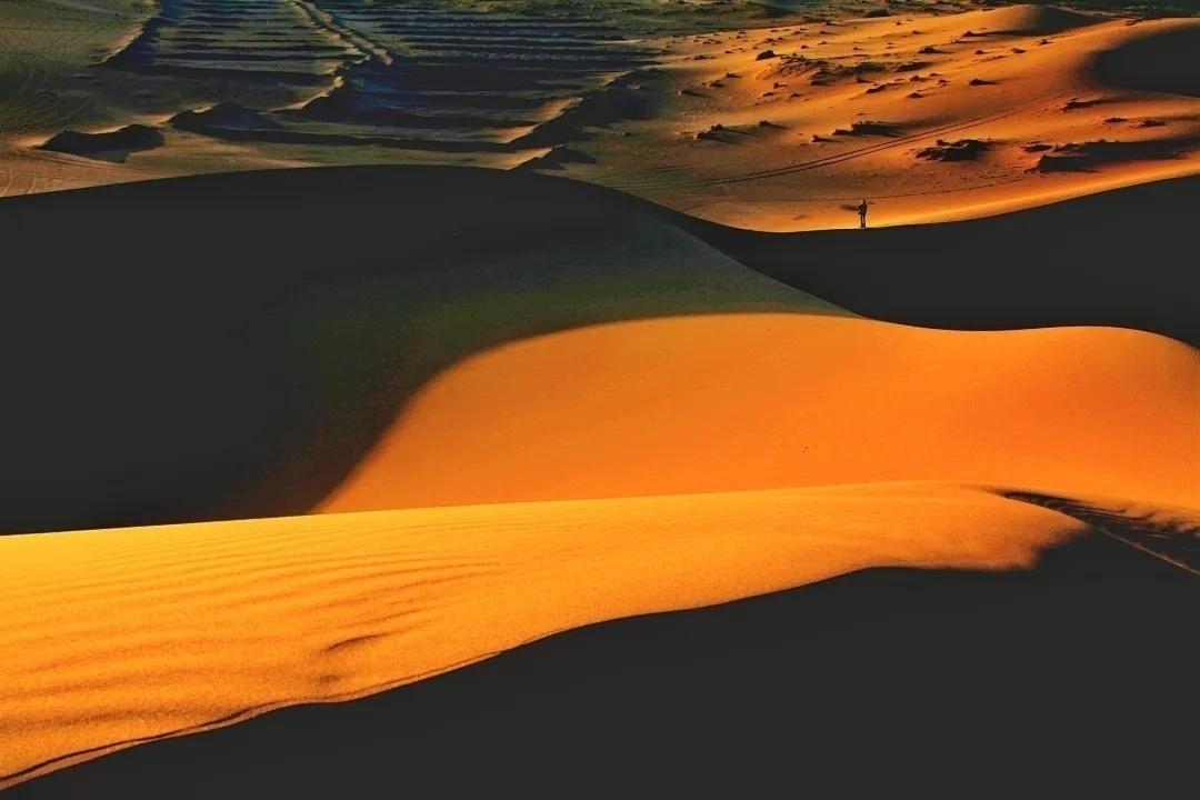 这里沙漠的颜色不止有黄色,光照过沙漠,有时像轻纱拂过,有时似河水流过,光变幻着,黄沙也变化着,变成金沙、棕沙、红沙……