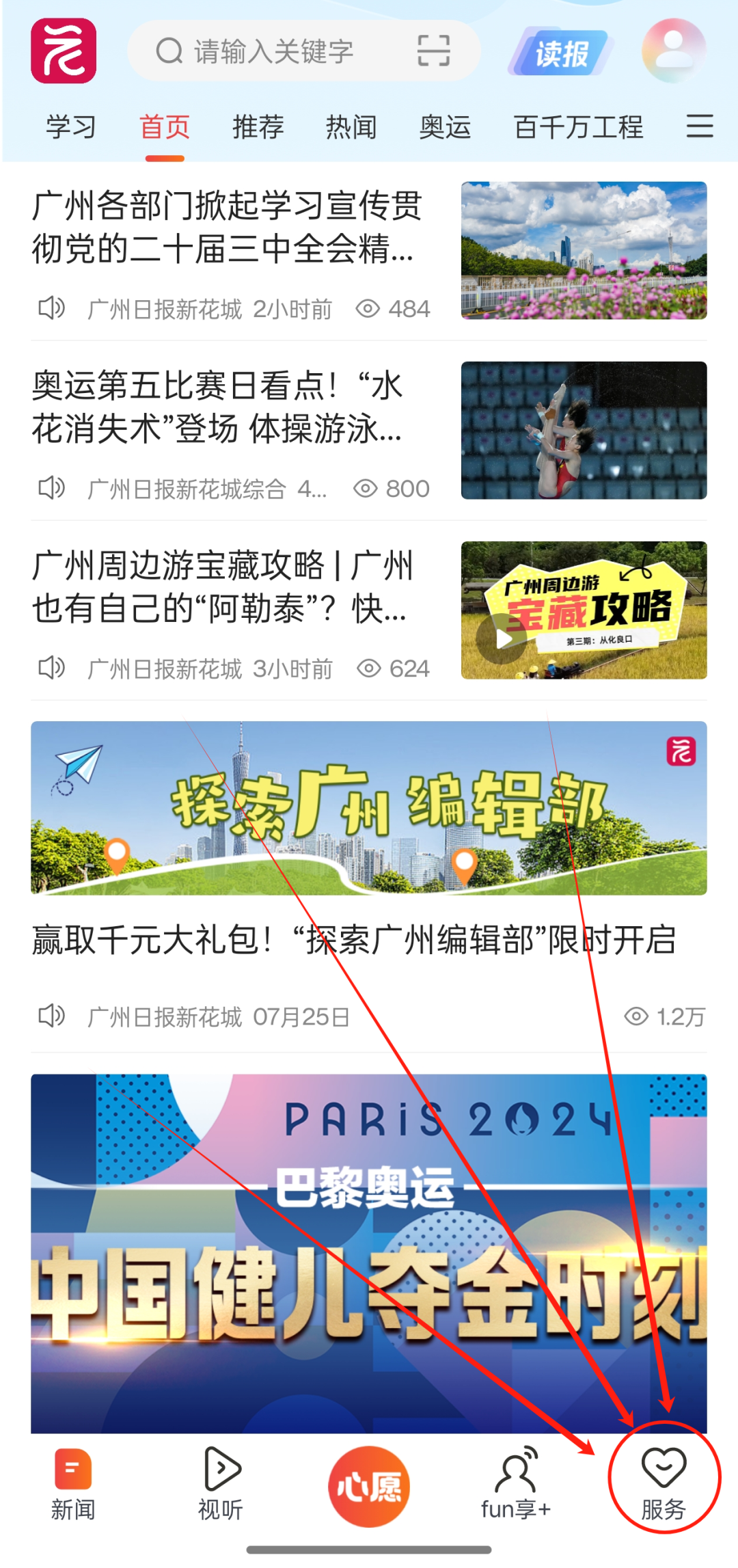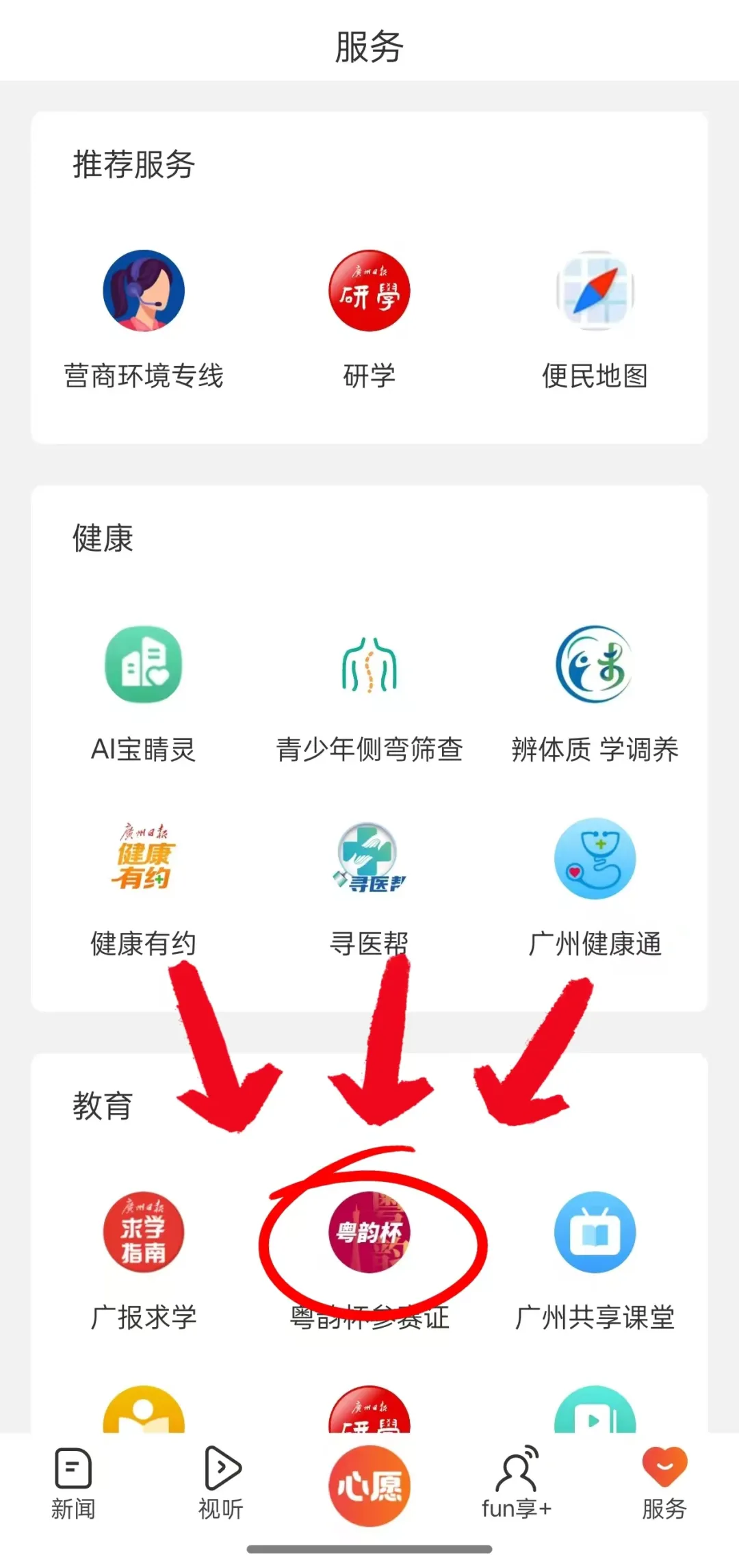下载广州日报新花城客户端,点击底部“服务”按钮,选择“粤韵杯参赛证”进入小程序。