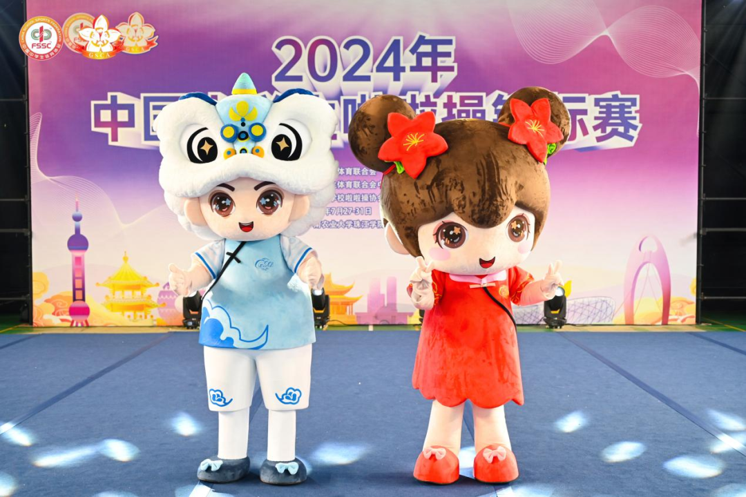 由华南农业大学珠江学院艺术设计学院师生共同设计的,展现醒狮、木棉花等广东特色元素的2024年中国中学生啦啦操锦标赛吉祥物——“粤粤”和“棉棉”,它们也在比赛现场为大家加油助阵。