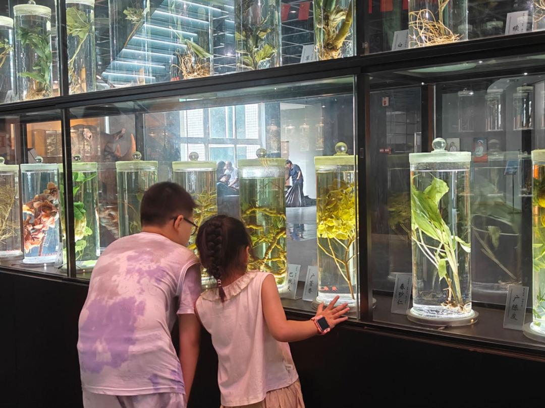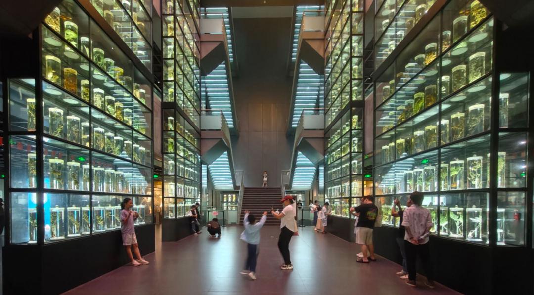 走进二楼大厅,高墙直达穹顶,入目满是幽微的绿色,充满生物美学的植物标本具有强烈的视觉冲击力,这就是吸引无数游客前来打卡的“中药水晶宫”。