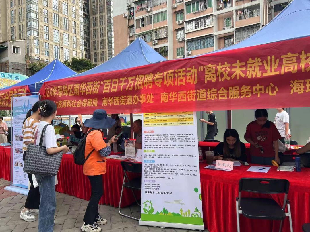 8月2日下午,在广州市海珠区人社局的指导下,海珠区南华西街道办事处在同福西地铁A出口举行了2024年海珠区“百日千万招聘专项行动”暨离校未就业高校毕业生招聘会。活动以离校未就业高校毕业生为主,面向广大求职者,吸引近700人次进场求职。招聘会共有52家企业参加,涵盖了交通、互联网、商务服务业等领域共计1200个职位。