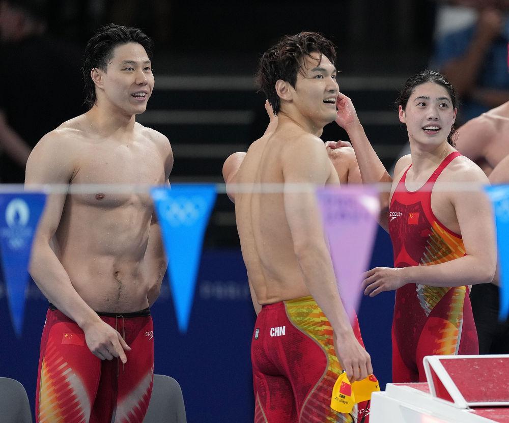 ↑亚军中国队选手覃海洋、徐嘉余、张雨霏(从左至右)在比赛后。