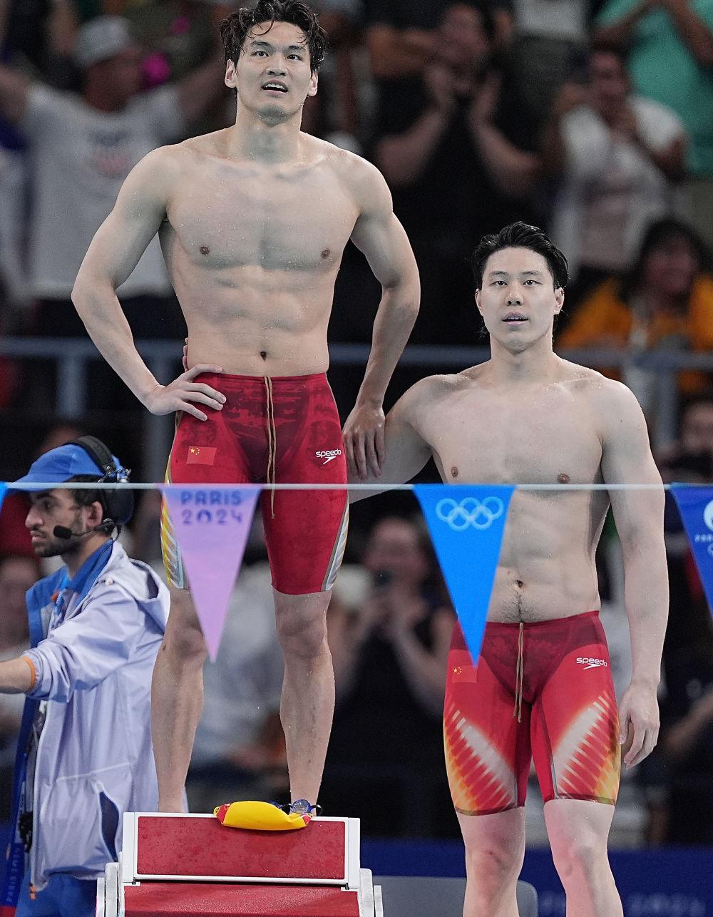 ↑中国队选手徐嘉余(左)、覃海洋在比赛后。