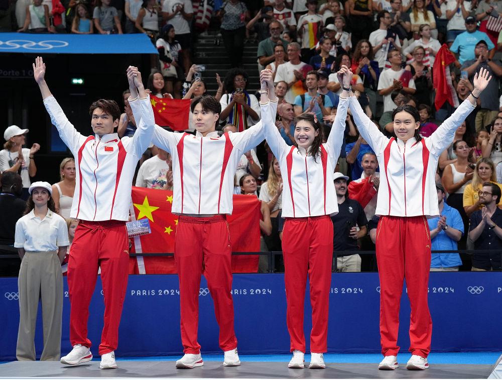 8月3日,巴黎奥运会游泳项目男女4x100米混合泳接力决赛在拉德芳斯体育馆举行,中国队以3分37秒55的成绩获得亚军并打破亚洲纪录,这也是本届奥运会中国游泳队的第九枚奖牌。