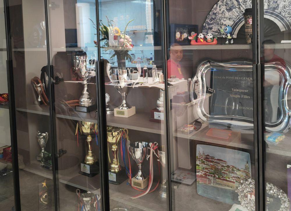 敲开房门,穿着红色短袖的郑建坪笑声爽朗。衣服正中,是巨大的单词“CHINA”(中国)。他的右侧,是一面摆满奖杯的玻璃荣誉柜。高高低低的冠军奖杯,见证了郑钦文从9岁到21岁的众多重要时刻。