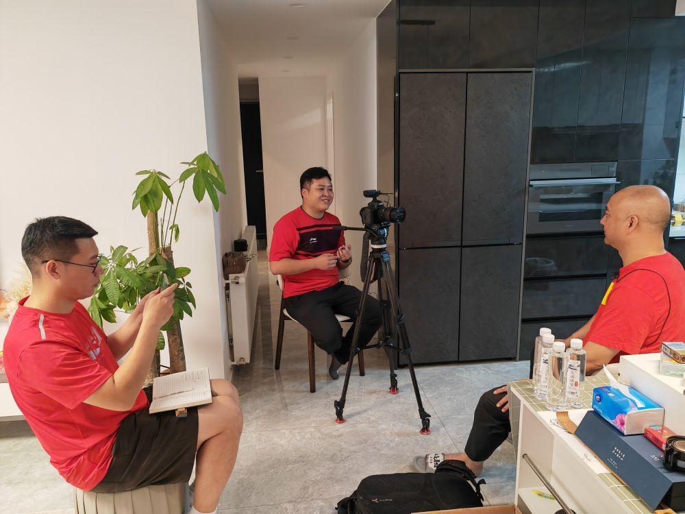 4日凌晨,郑建坪(右一)接受新华社记者专访。新华社记者 梁建强 摄