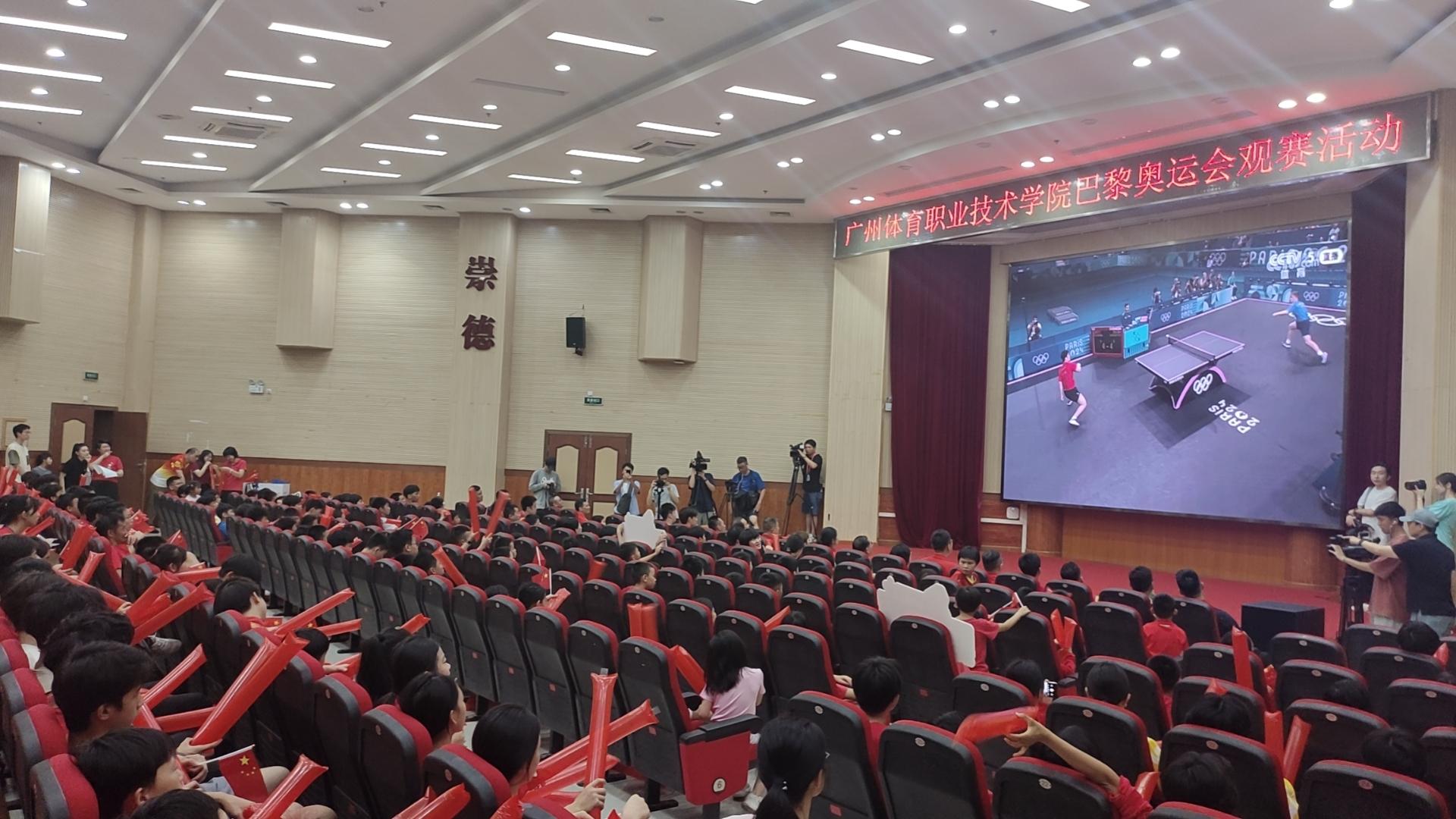 8月4日晚上,广州体育职业技术学院举行了自主培养输送的运动员樊振东参加巴黎奥运会乒乓球男单决赛的观赛活动。学院的阶梯大礼堂全部爆满,200多号学院的学子都聚精会神通过电视转播观看樊振东的比赛实况。虽然第一局樊振东落后,但他很快就追回一局。“樊振东加油!樊振东必胜!”广州市增城区业余体校乒乓球训练馆内,小队员们为樊振东高声呼喊。