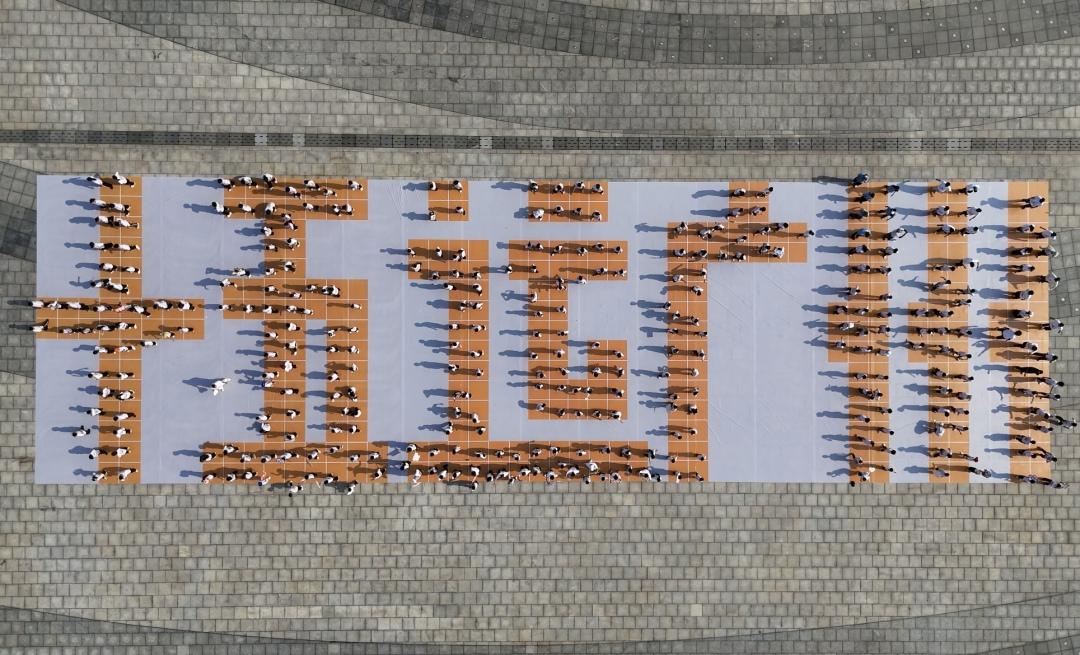 街舞少年们在广州塔下摆出“十五运广州”字样,表达对全运会的期盼。
