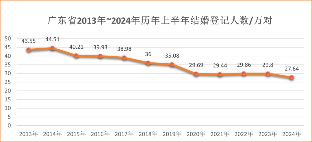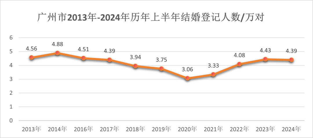 记者查阅广东民政事业统计季报了解到,2024年上半年,广东结婚登记数同样出现了下滑。全省2024年上半年结婚登记数为27.6万对,同比2023年上半年的29.8万对,减少了2.2万对。而广州2024年上半年结婚登记数为4.39万对,同比2023年上半年的4.43万对减少了0.04万对,变化幅度不大。