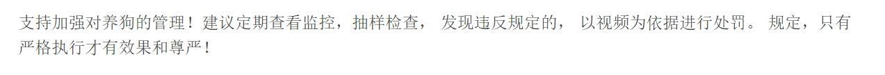 二是持续开展“睦犬”行动。全面加大执法巡查力度和巡查频次,严格查处遛狗不牵绳、不及时清理犬只粪便、犬只扰民等不文明养犬行为和犬只伤人行为。如发现违法违规养犬行为,市民可第一时间拨打12345热线或联系街道综合行政执法队伍,依法进行查处。