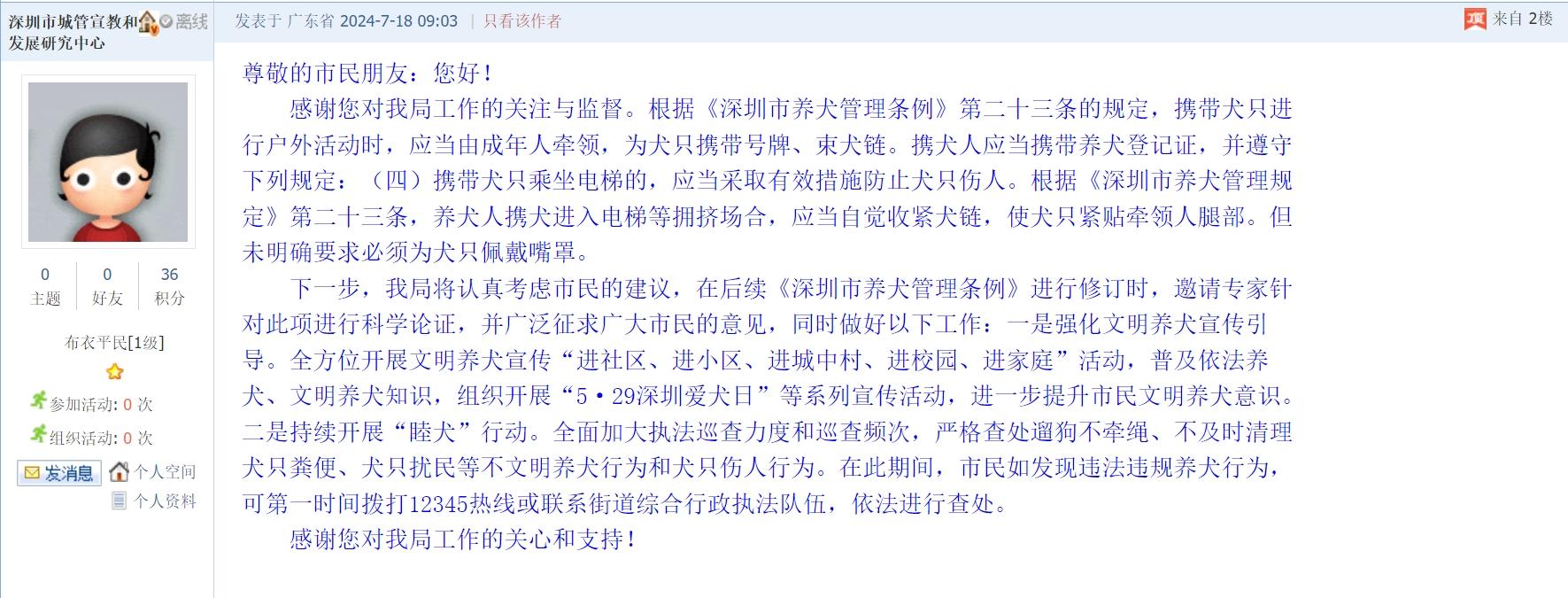 深圳市城管宣教和发展研究中心称,下一步,将认真考虑市民的建议,在后续《深圳市养犬管理条例》进行修订时,邀请专家针对此项进行科学论证,并广泛征求广大市民的意见,同时做好以下工作: