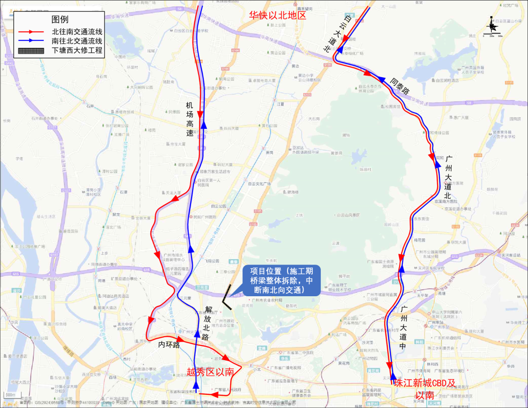 下塘西路(广园中路—政通路)东侧保留南往北单向1车道通行,西侧(广园中路—政民路)中断北往南方向通行,车辆绕行政通路;